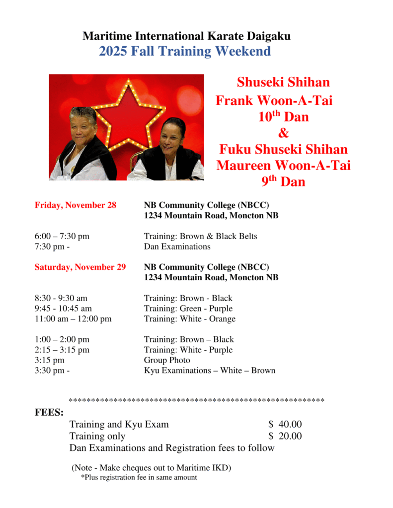 The Maritime IKD will be hosting the annual Fall Clinic and grading November 28-29 in Moncton, NB.